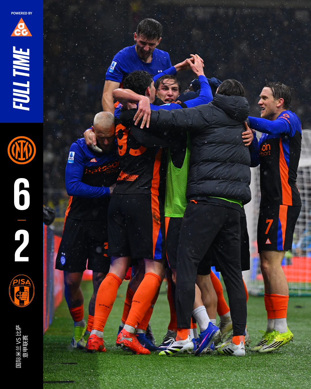 北京时间1月24号3:45,2025/26赛季意甲联赛第22轮主场对阵比萨。上半场对手先进两球的情况下,泽林斯基点射破门,劳塔罗和皮奥各入一球上演让二追三。下半场迪马尔科再下一城,博尼替补建功,补时阶段姆希塔良也斩获一球,最终我们6比2逆转比萨!